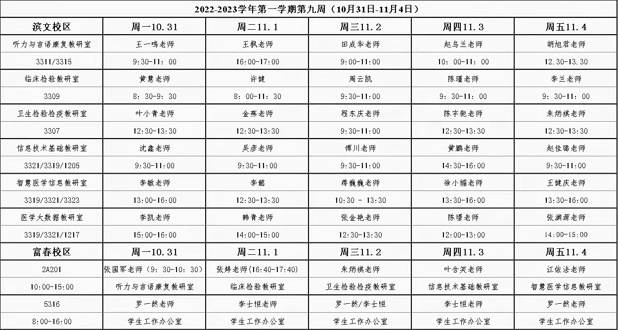 详见Open Office Hours安排表,每周五在学院网站等公布下周具体安排表,2022-2023学年第一学期第九周(10月31日-11月4日)安排详见附表。
